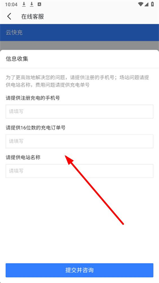 4、在在线客服页面,填写所需信息,点击提交并咨询,即可联系到云快充的在线客服。