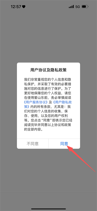 1、在爱山东的用户协议及隐私政策弹窗中,点击同意,进入应用主页面。