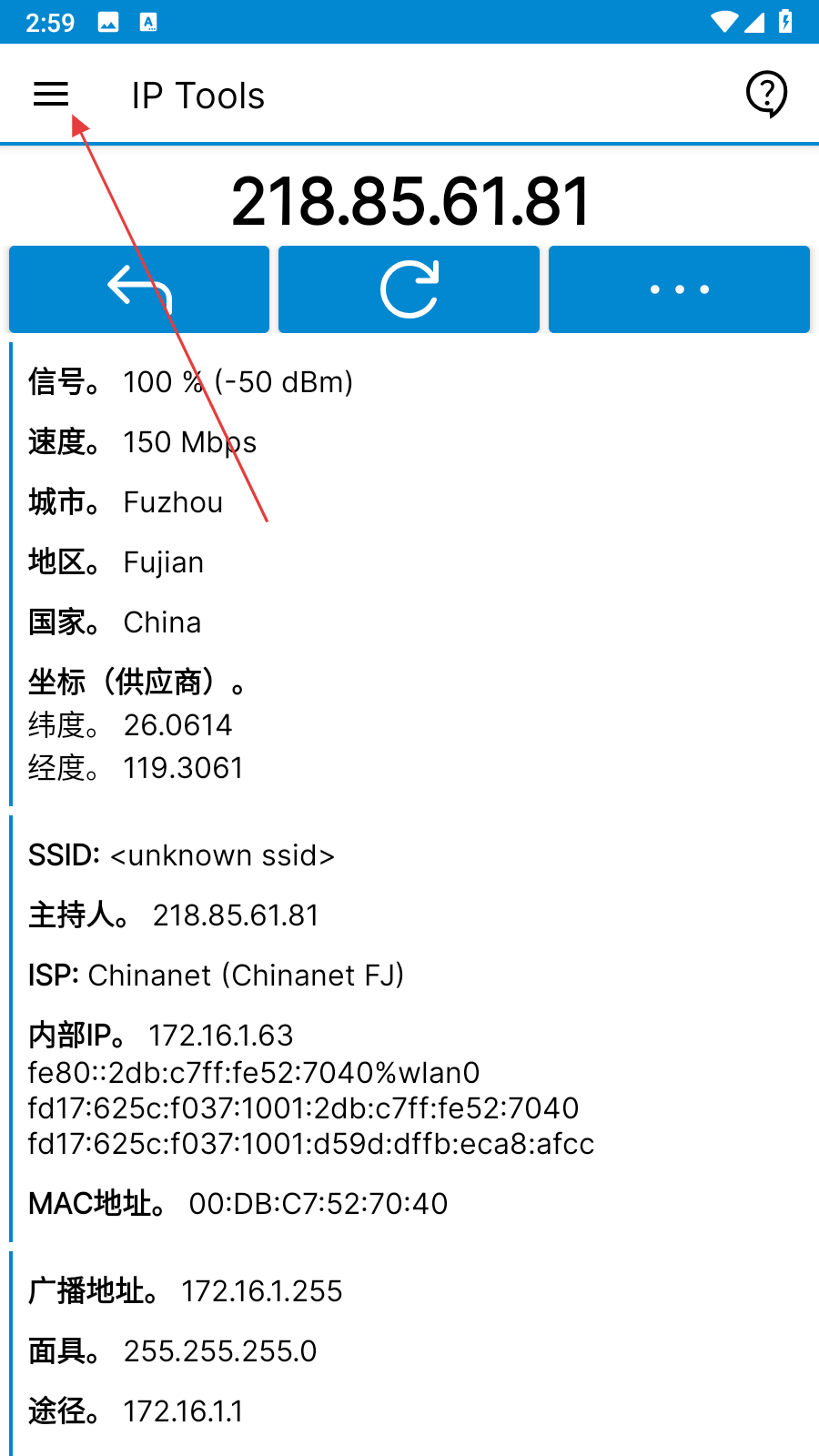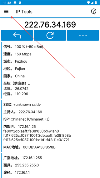 1、打开IP Tools应用,点击界面左上角的三条横线菜单图标,展开功能列表。