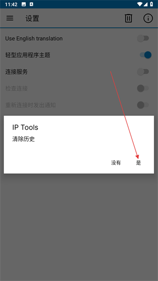 4、在弹出的清除历史提示框中选择是按钮,完成IP Tools的历史数据清除操作。