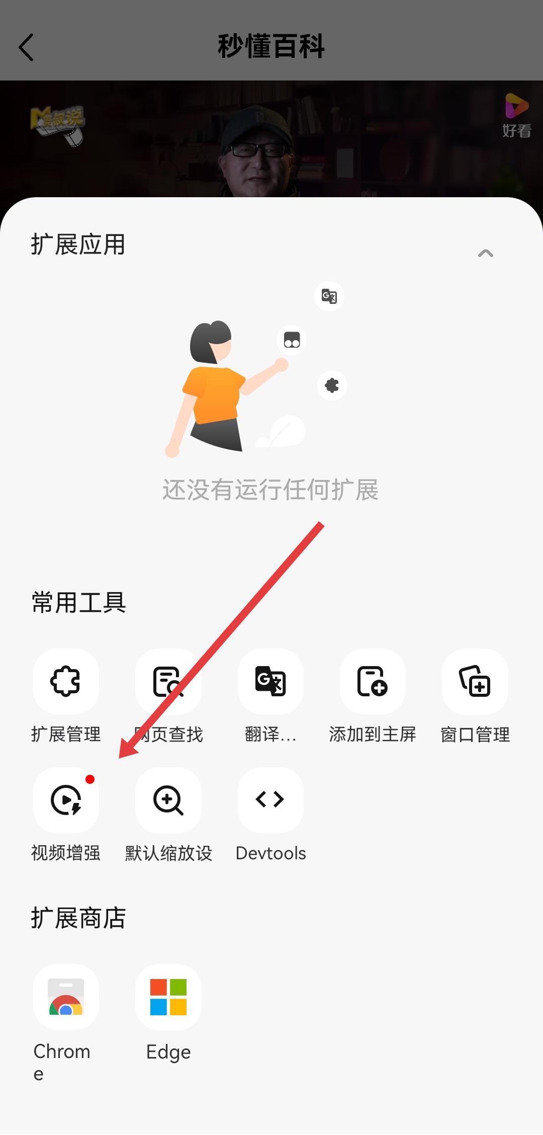 1、在狐猴浏览器打开视频播放页面后,点击底部右侧的扩展应用按钮,弹出功能菜单。