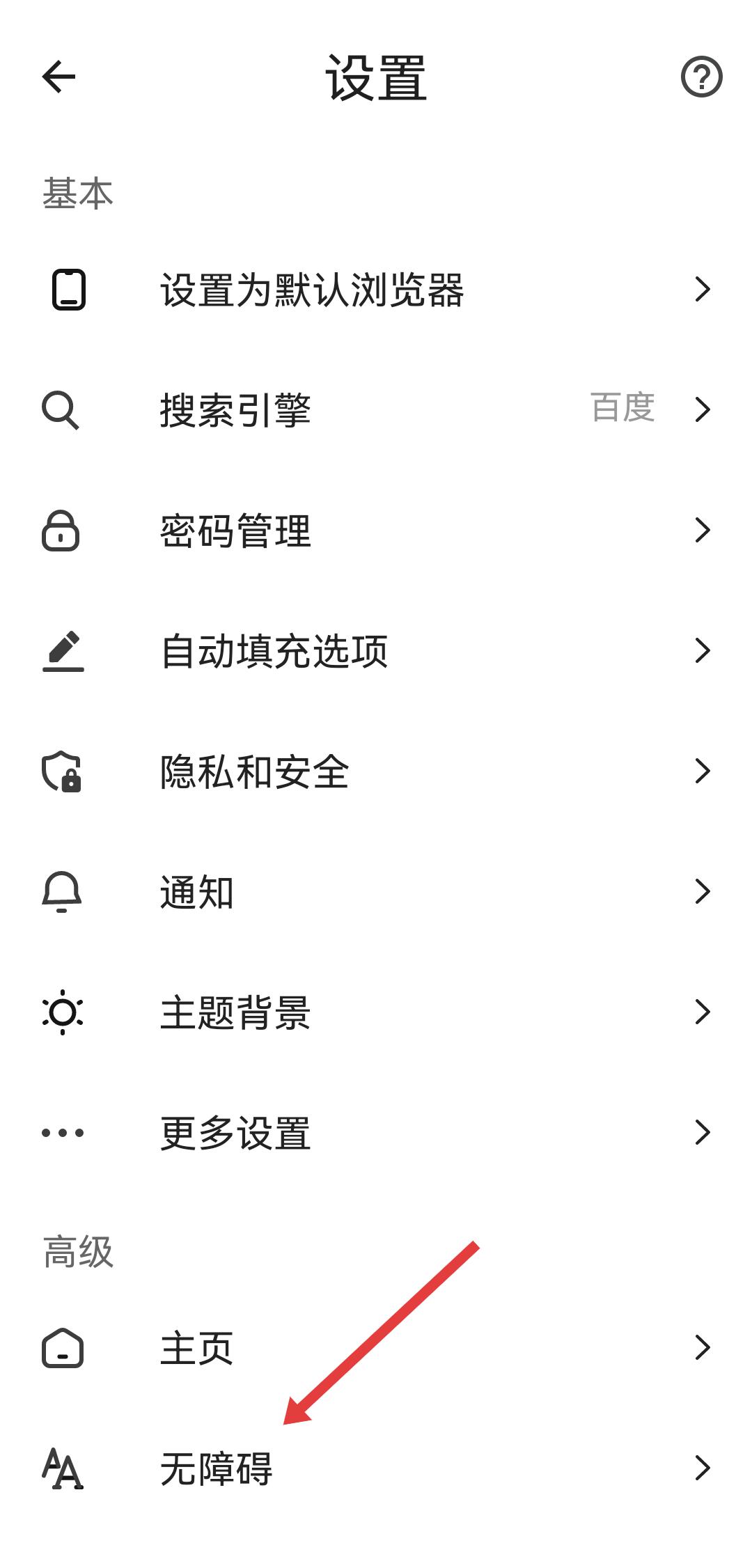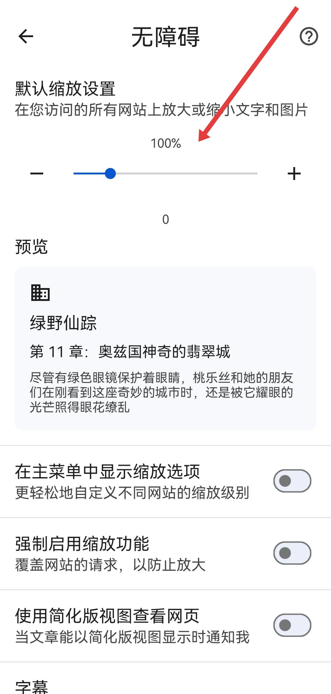 3、在无障碍设置页面里,拖动默认缩放设置的滑块,滑块向右增大,向左减小调整网页字体大小。