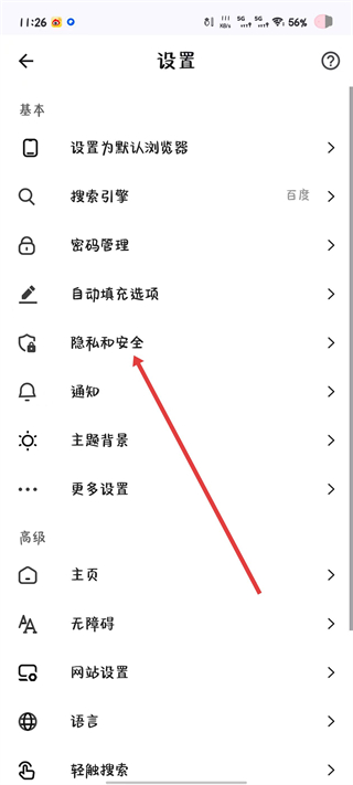 3、在设置界面里找到隐私和安全选项,点击进入隐私安全页面。
