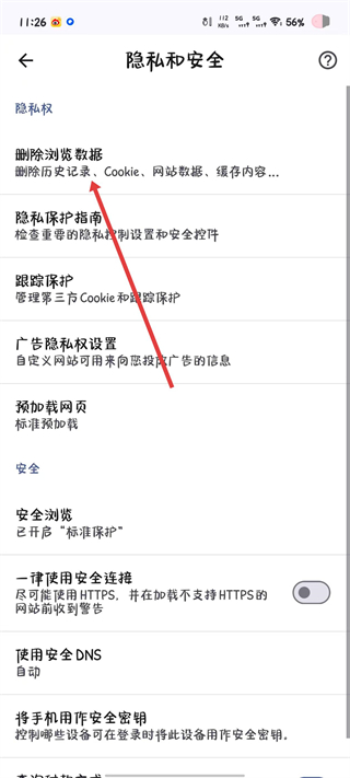 4、在隐私和安全页面中选择删除浏览数据,进入数据选择界面。
