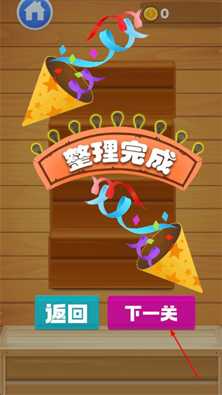 4、看到整理完成提示后,点击紫色的下一关按钮,进入下一个整理关卡。