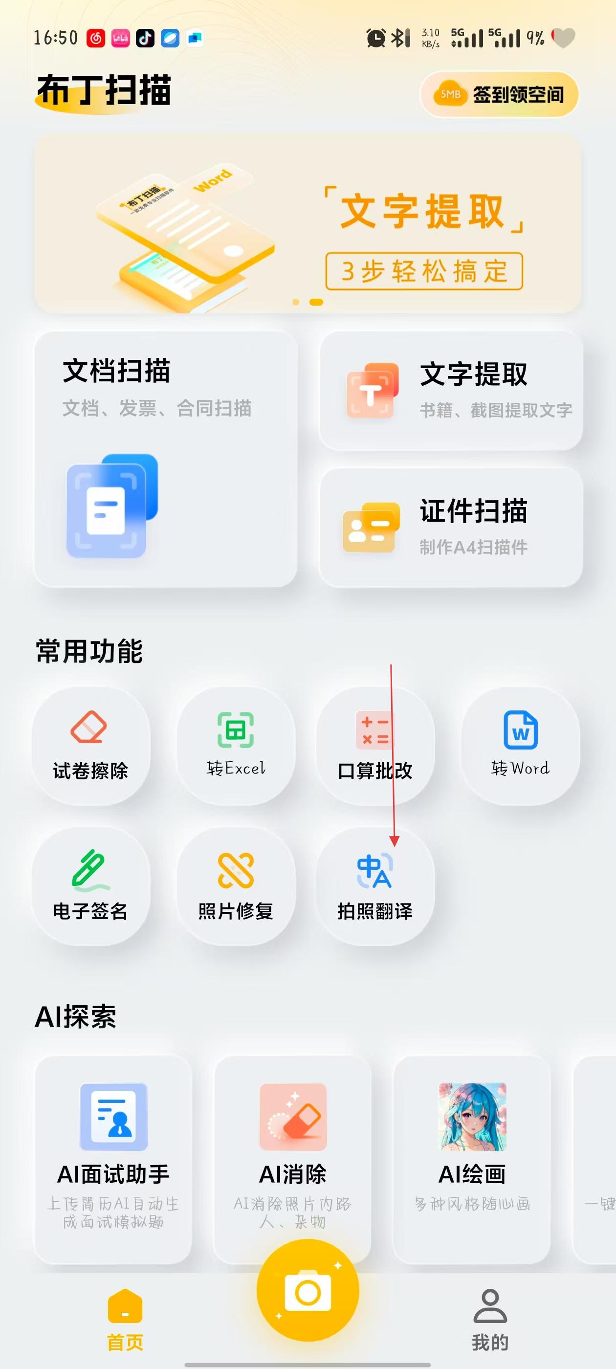 1、打开布丁扫描,点击拍照翻译,进入拍照翻译。