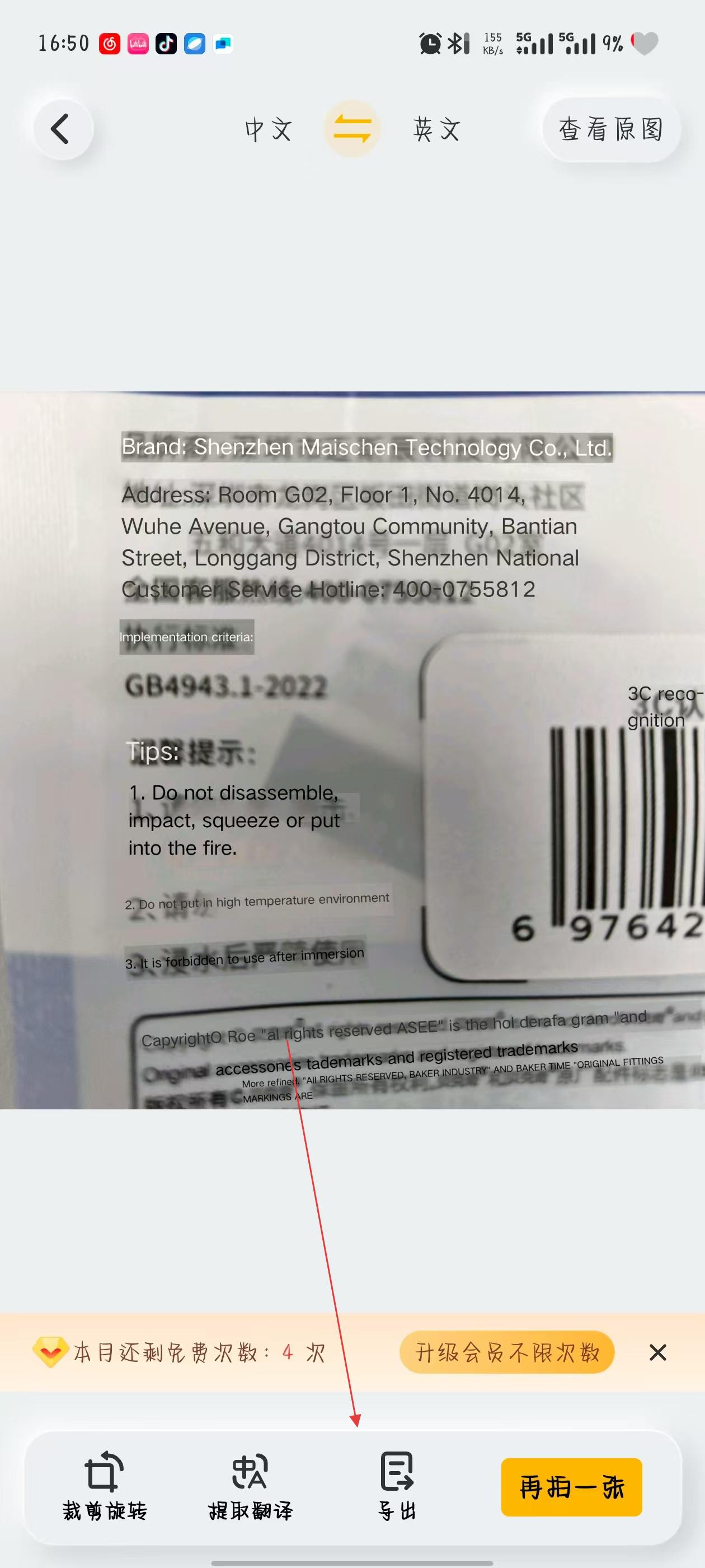3、识别出来之后,点击下方的导出,如果拍的不完整可以点击再拍一张。