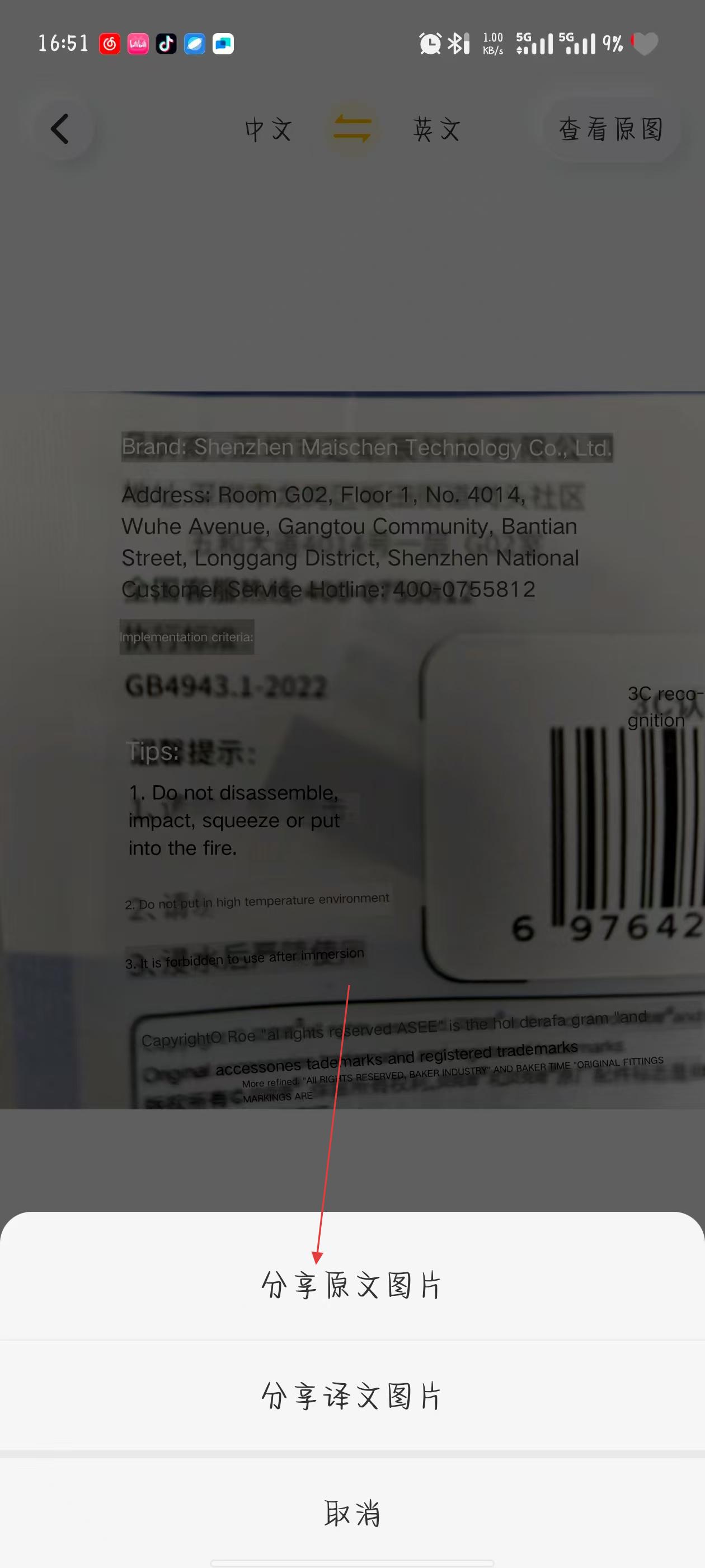 4、点击导出之后,可以选择分享原文图片或者分享译文图片。