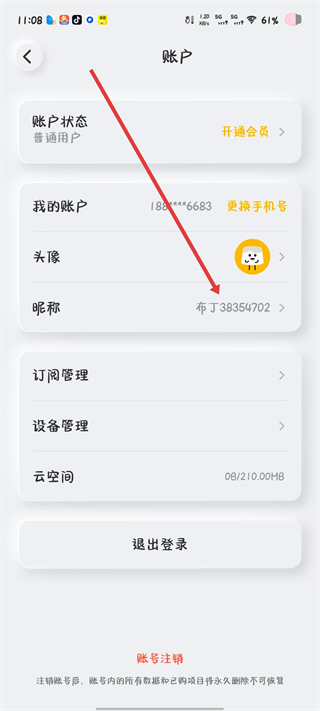3、在账户页面中找到昵称选项,点击后进入昵称编辑界面。