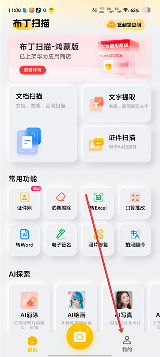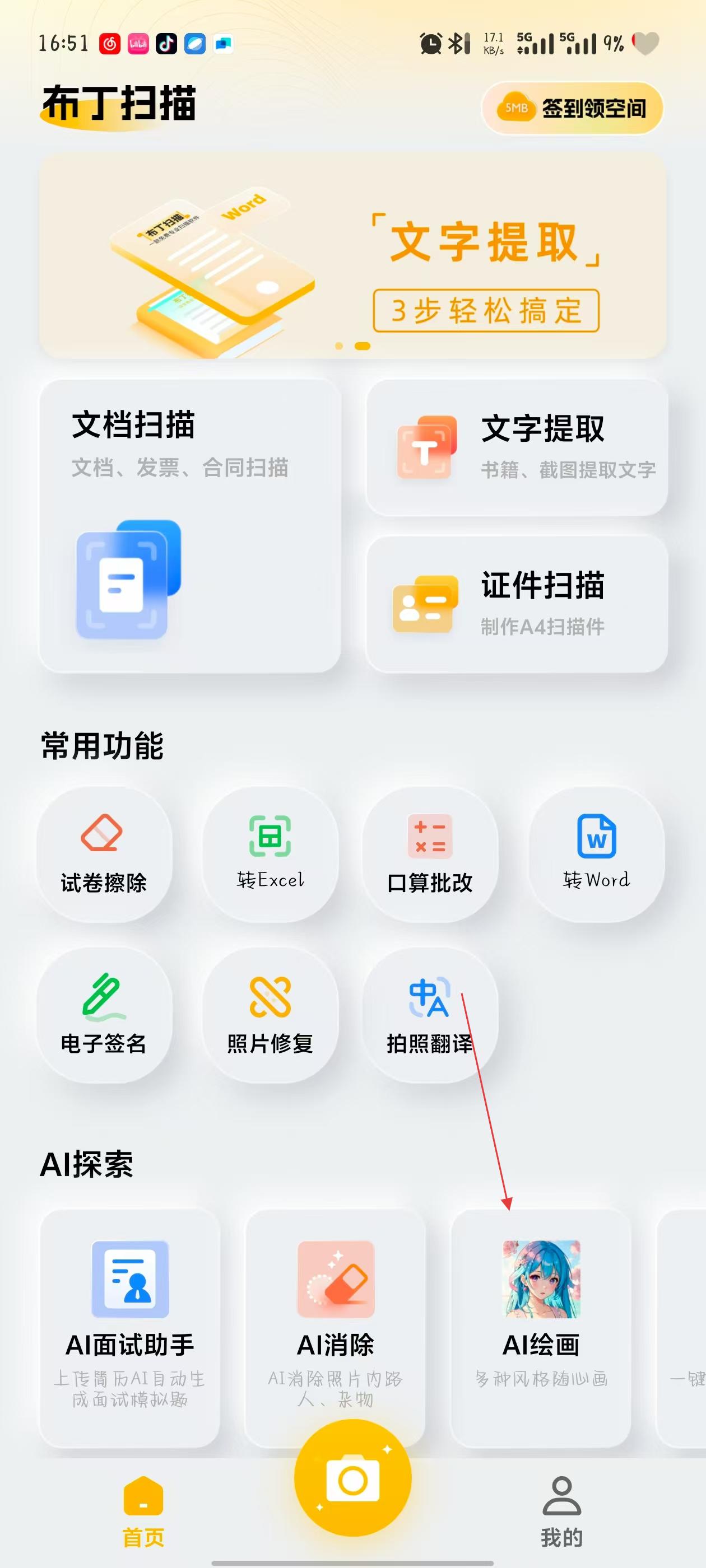 1、打开布丁扫描APP,在首页找到并点击AI绘画功能模块,进入AI绘画相关页面。