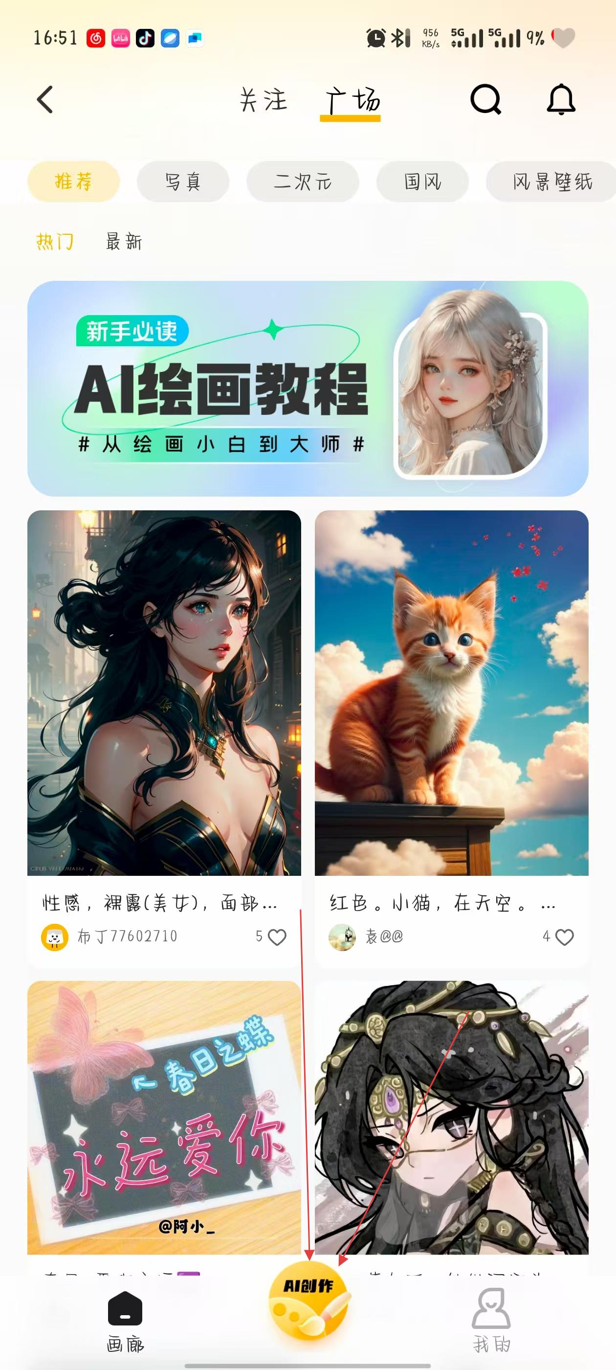 2、在AI绘画页面,点击底部的AI创作按钮,进入具体的创作设置界面。