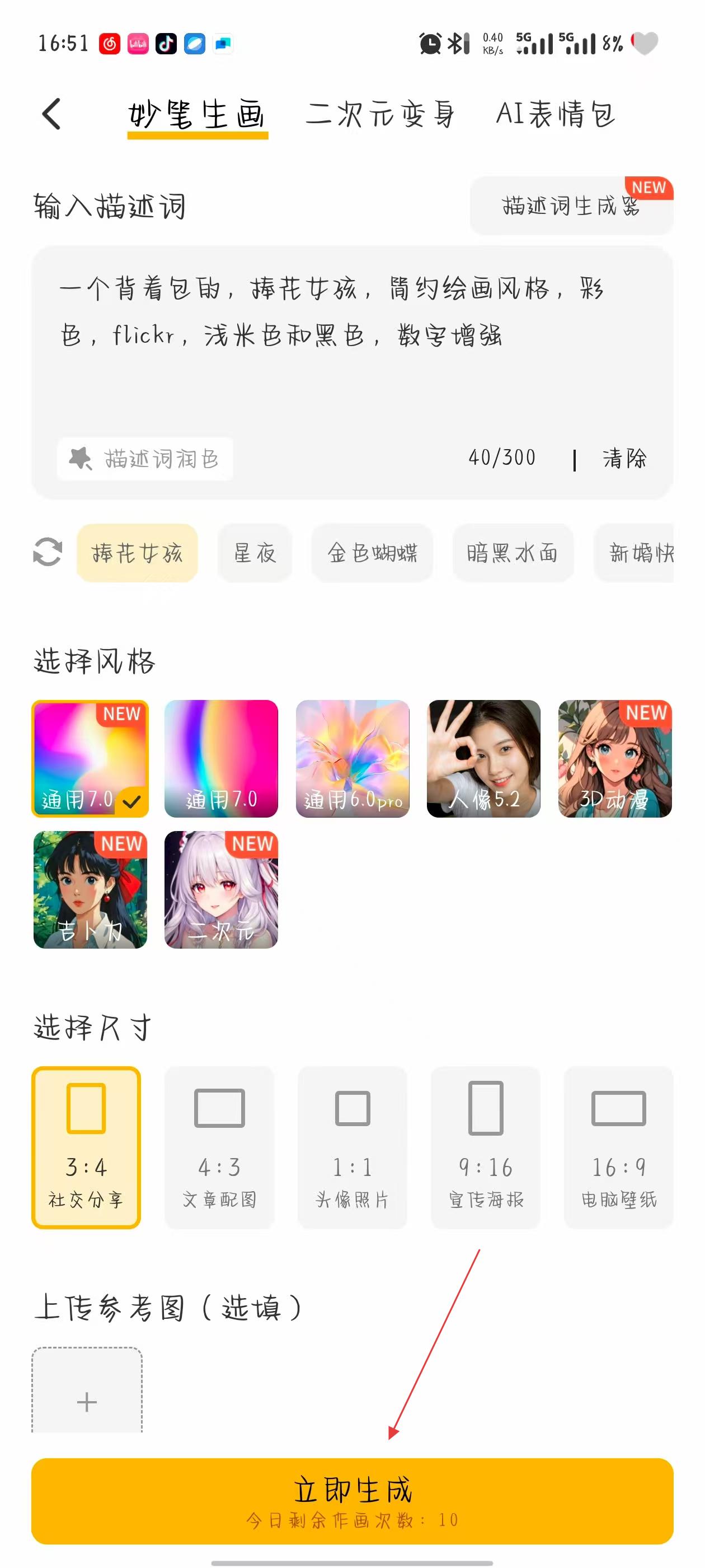 3、在创作界面的输入描述词,点击底部的立即生成按钮,等待AI生成图像。