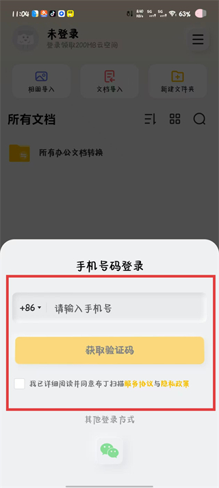 3、在登录界面中,输入要登录的手机号码,点击获取验证码。