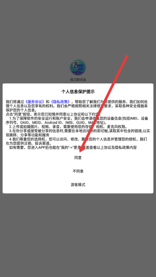 1、打开维汉翻译通,出现弹窗可以点击同意后进入APP。