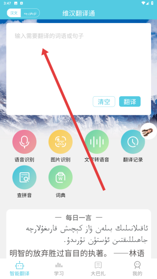 3、在维汉翻译通首页中,可以在上方输入框中输入维语后翻译汉语。