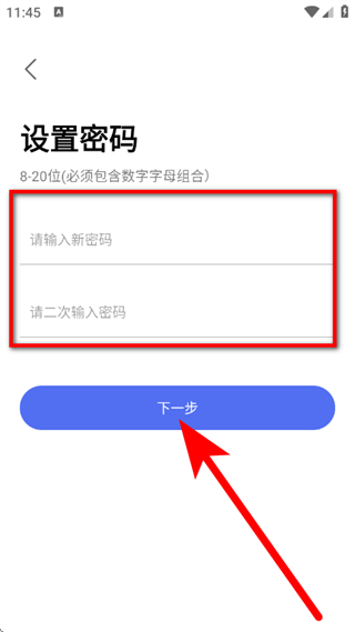 4、在设置密码页面,设置新密码,点击下一步。