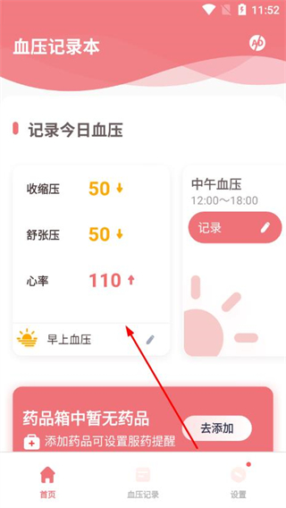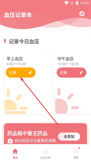 1、打开血压记录本app首页,选择对应时段,点击记录,进入血压记录页面。