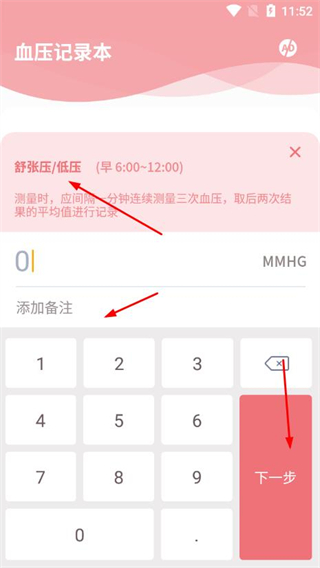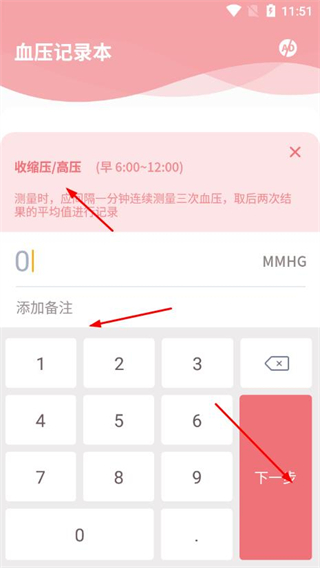 2、在收缩压/高压页面,输入测量的收缩压数值,可添加备注,点击下一步。