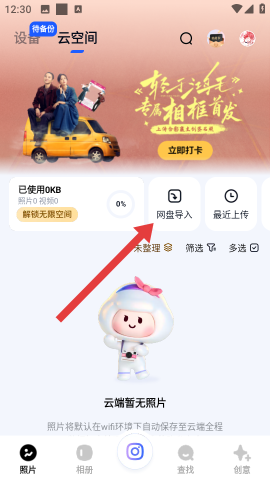 1、打开一刻相册APP,切换到云空间页面,点击网盘导入按钮,进入百度网盘文件选择界面。