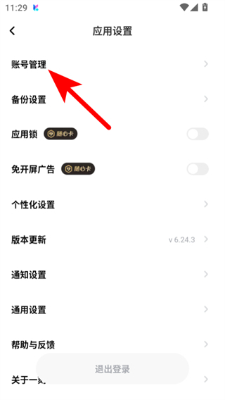 3、在应用设置页面,点击账号管理选项,进入账号管理页面。