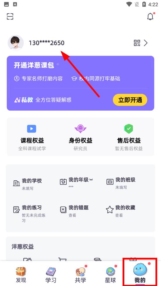 1、打开洋葱学园APP,点击左上角的头像,进入个人信息页面。