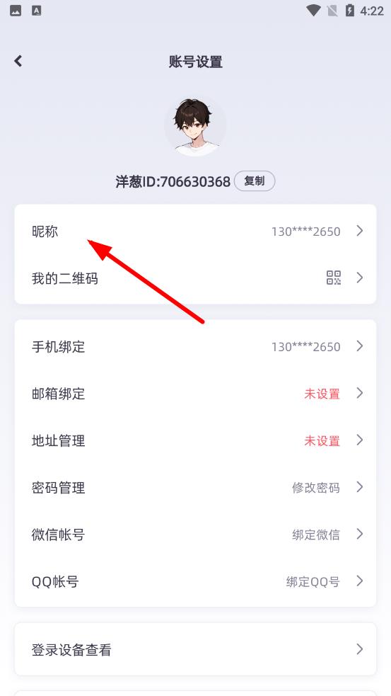 2、进入账号设置页面后,点击昵称选项,进入修改昵称界面。