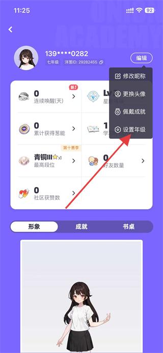 3、在菜单中选择设置年级选项并点击,进入年级选择页面。