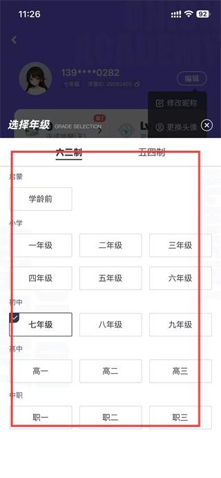 4、在年级选择页面中,选择学段和年级,即可完成年级切换。