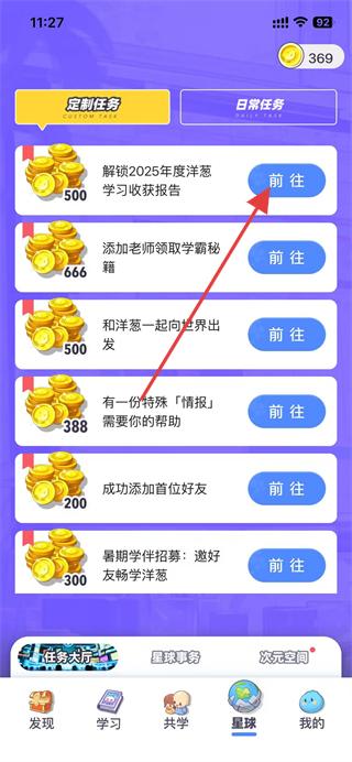 2、在星球页面中,选择并点击上方的定制任务板块。