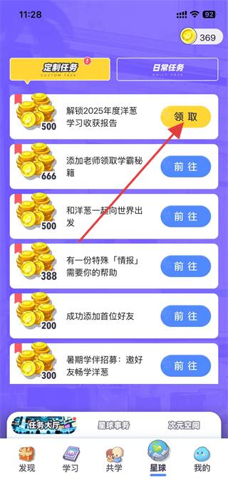 4、任务完成后返回,点击领取按钮即可获得洋葱币。