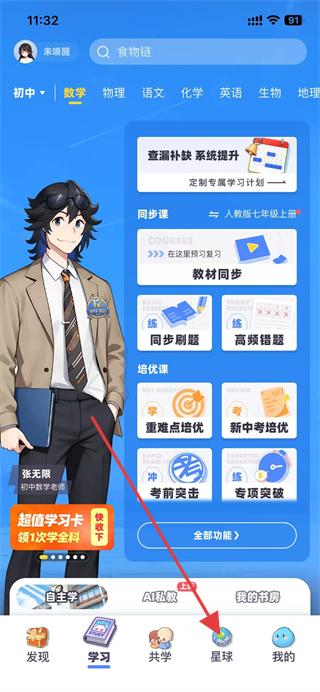 1、打开洋葱学园APP,点击底部导航栏的星球选项。