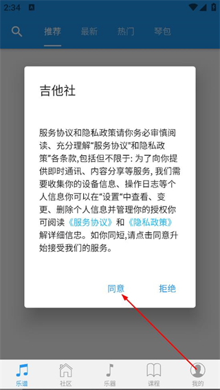 1、在服务协议和隐私政策弹窗中,点击同意,进入首页。