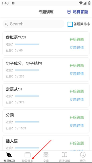 1、在专题训练页面,点击底部的阶段练习选项,进入阶段训练页面。