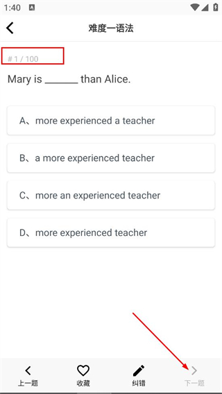 3、在难度一语法的题目页面完成当前题后,点击下一题,继续作答后续题目。