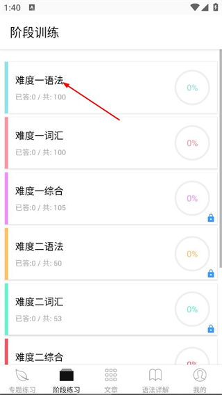 2、在阶段训练页面,点击难度一语法选项,进入该练习的题目页面。