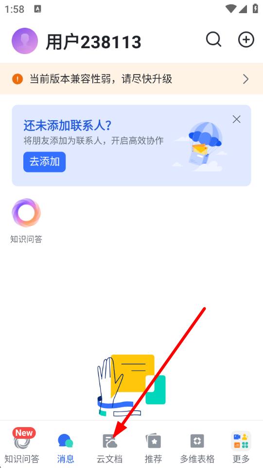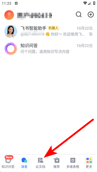 1、在飞书主界面点击底部云文档,进入云文档页面。