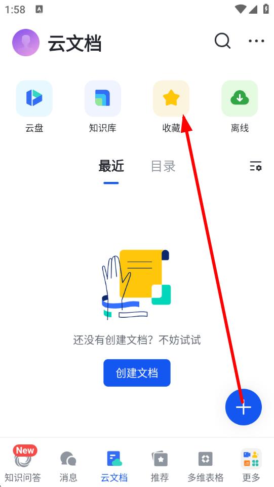 2、在云文档页面点击上方收藏,查看收藏内容。