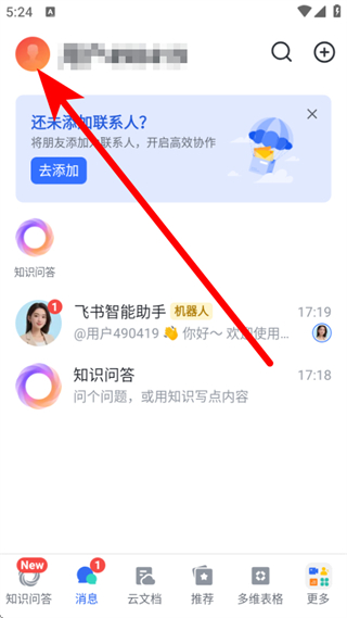 1、在飞书的界面,我们需要点击左上角头像,展开个人菜单。