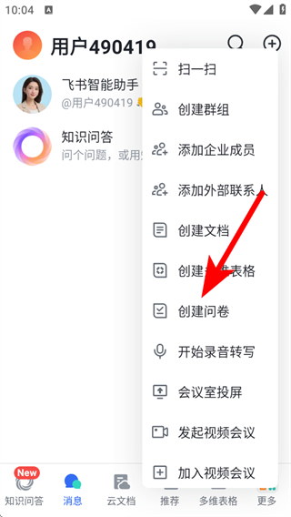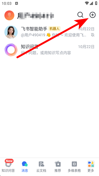 1、打开飞书APP,需要点击界面右上角的+按钮,展开功能菜单。