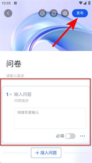 3、在问卷编辑页面,输入问卷描述,添加问题并设置相关选项后点击发布。