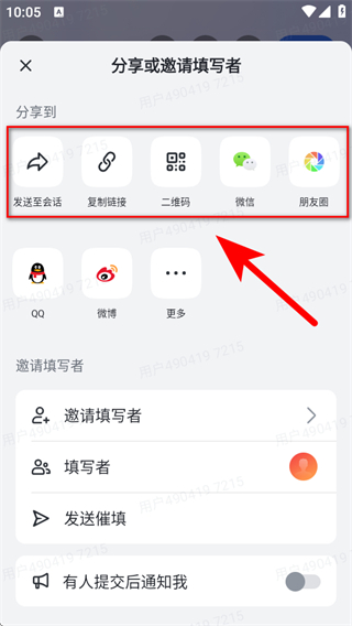 4、在分享界面选择合适的分享方式,即可将问卷分享给填写者,完成创建操作。