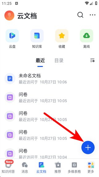 2、在云文档页面,点击右下角的+号,弹出创建选项列表。