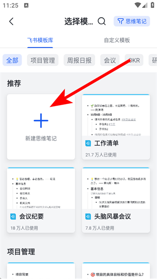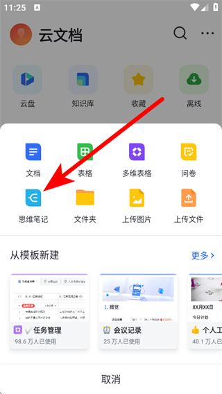 3、在创建选项中,点击思维笔记,进入选择模板的页面。