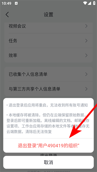 4、在提示框中点击退出登录用户组织’,完成退出登录操作。