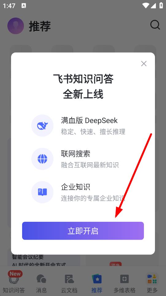 3、进入应用后,若弹出飞书知识问答全新上线弹窗,点击立即开启使用相关功能。