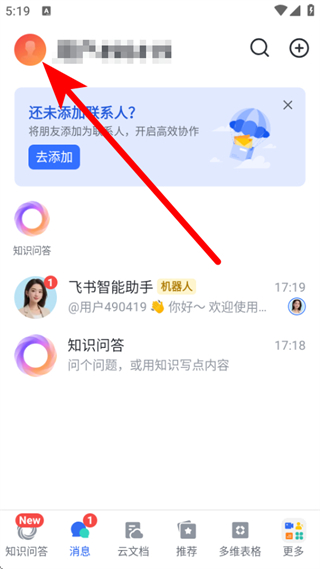 1、在飞书的界面,需要点击左上角头像,展开个人的菜单。