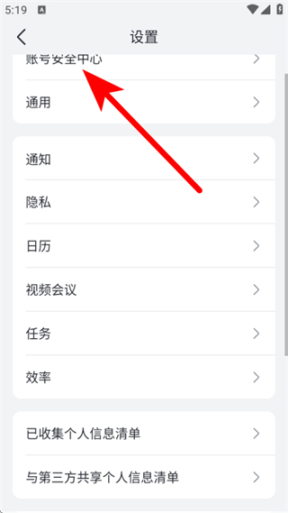 3、在设置的页面,点击账号安全中心,进入安全管理的页面。
