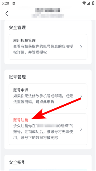 4、在安全管理的页面,点击账号注销,按提示完成账号注销操作。