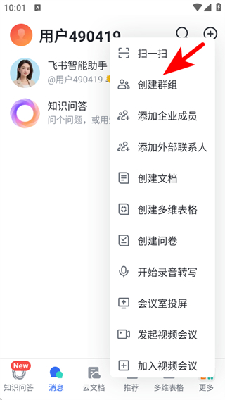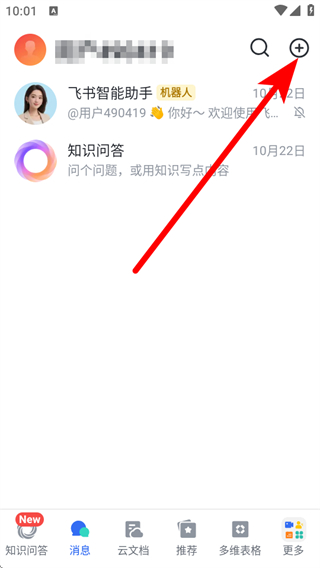 1、打开飞书APP,点击界面右上角的+按钮,展开功能的菜单。