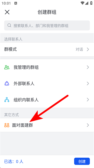 3、在创建群组页面,点击面对面建群,进入面对面建群设置界面。